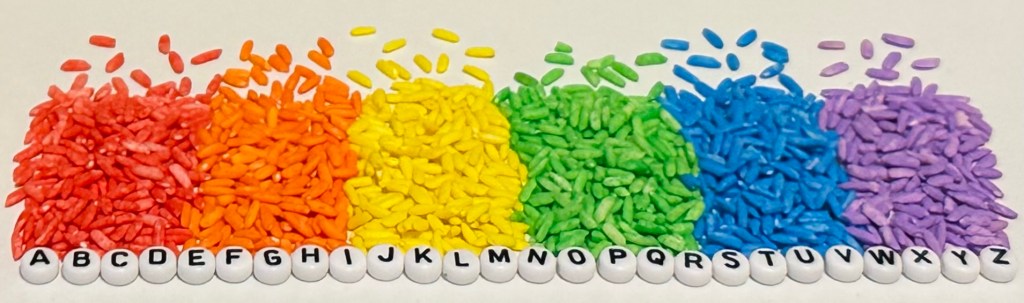 - Add all of your colors of rice and letter beads to a clean plastic bottle.