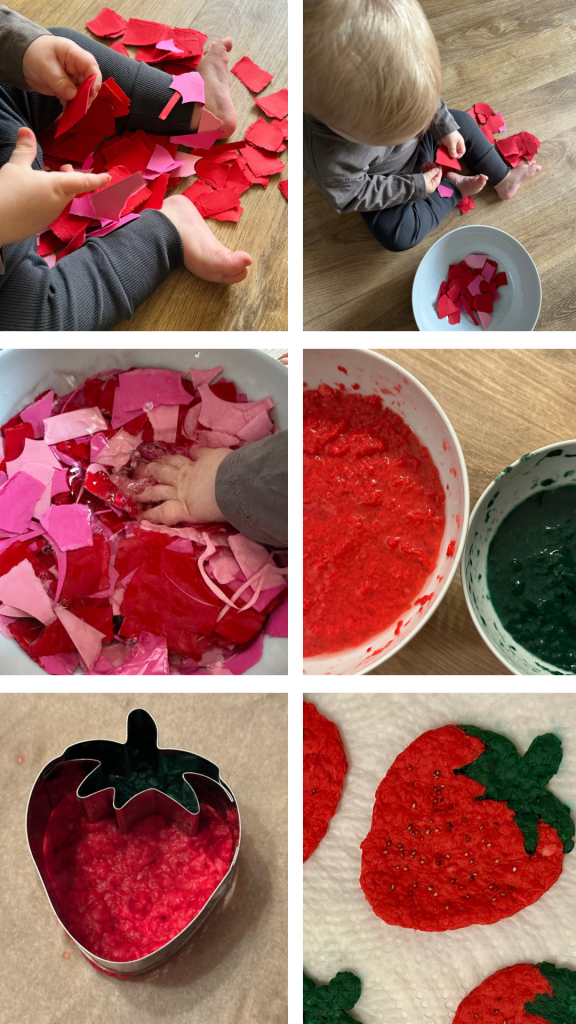 - Place your red and pink paper scraps in one bowl and the green in a separate bowl